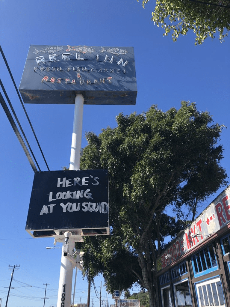 Riding north to campus, I’d pass by the Reel Inn and they had this giant board where they would write a fish-related pun in chalk, and usually have a funny little drawing.