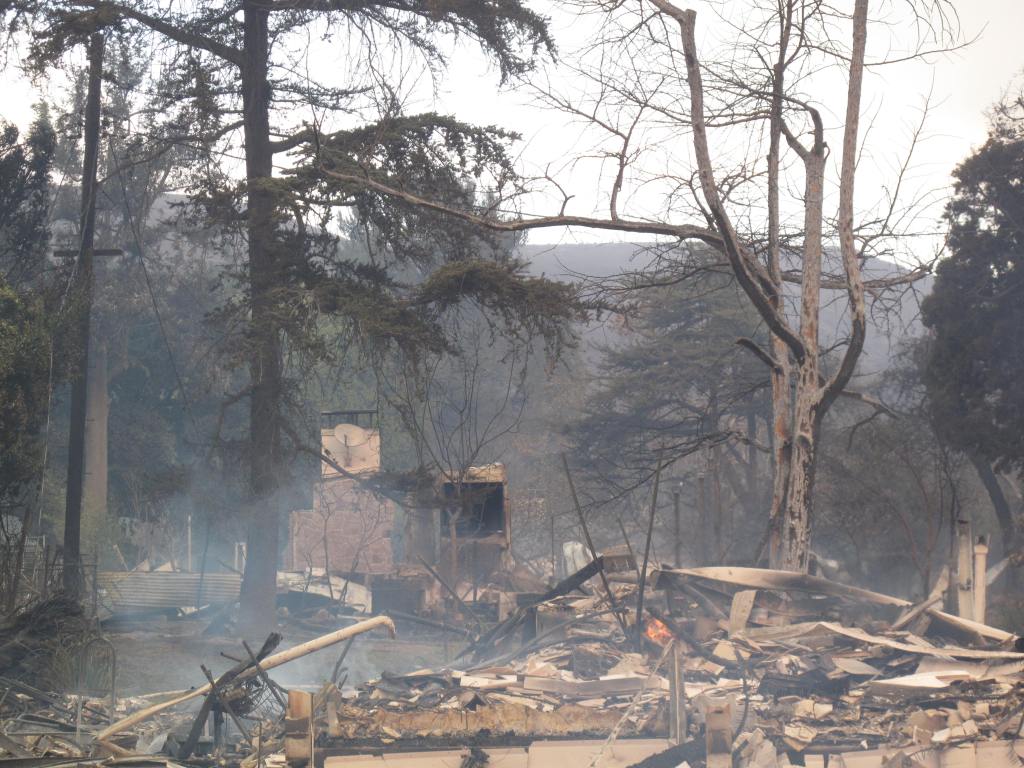 When I reached the top of the climb, I looked left and saw an entire neighborhood destroyed. I heard sprinklers, wind, and fire alarms.